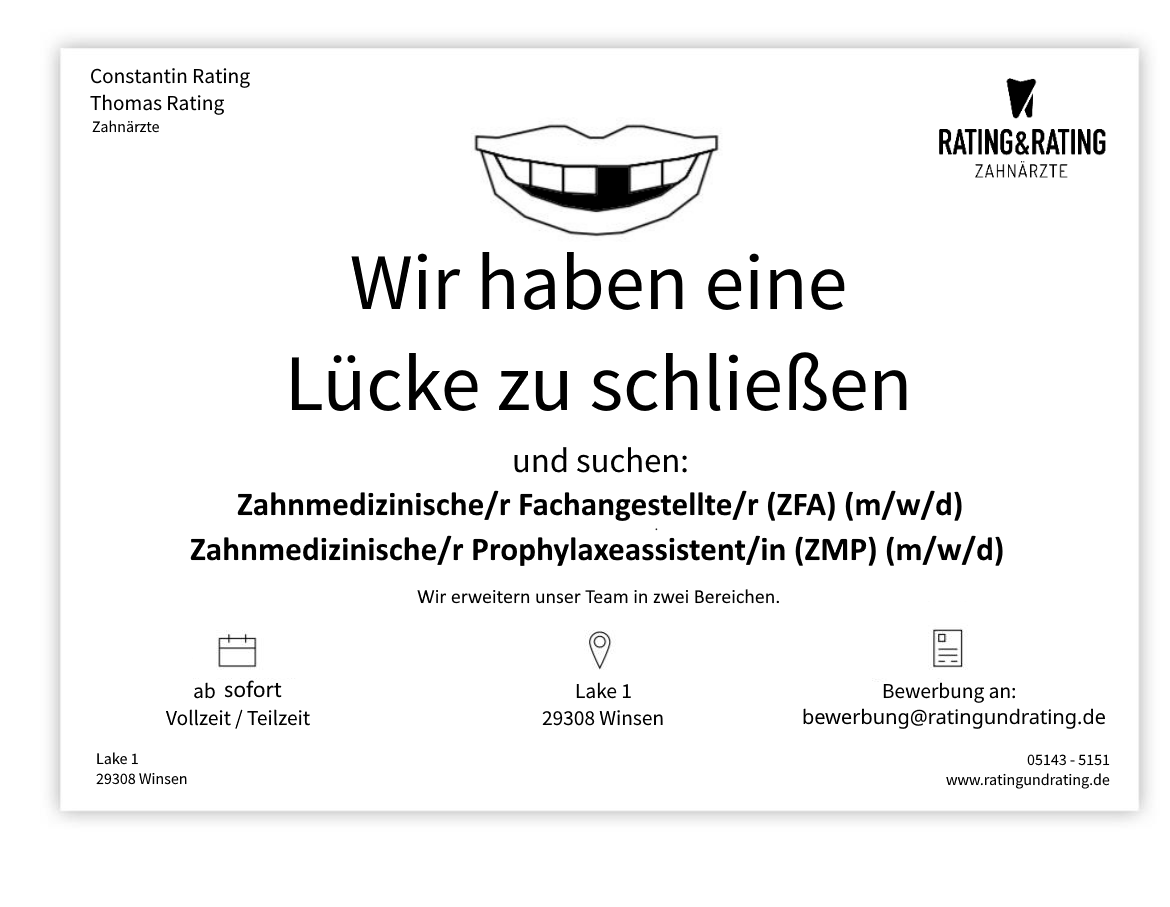 Ein perfektes Lächeln und schöne Zähne sind heute immer wichtiger im Alltag, denn sie vermitteln unsere Persönlichkeit nach außen. Unser Ziel ist es, dass Sie sich wohl und immer gut informiert fühlen. Gemeinsam erarbeiten wir mit Ihnen Behandlungskonzepte und mögliche Alternativen und finden so die beste Lösung für Ihre Situation. Mit über 44 Jahren Erfahrung bietet Ihnen die Zahnarztpraxis Rating in Winsen Aller - nun auch in der 2. Generation mit Zahnarzt Constantin Rating - Zahnmedizin auf dem aktuellsten Stand. Hier finden Sie alle Informationen zu unserer Philosophie, unseren Leistungen und unserem Team.